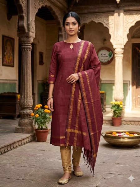 Crafted from premium Kanchi Cotton, renowned for its smooth texture, breathable comfort, and durable quality. The fabric carries a subtle natural sheen that enhances its rich, traditional charm.