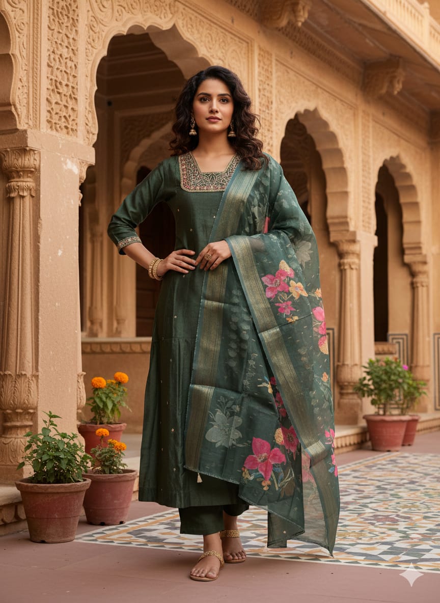 🌸 Fabric: Premium Vatican Silk (Kurti & Bottom) with soft lining