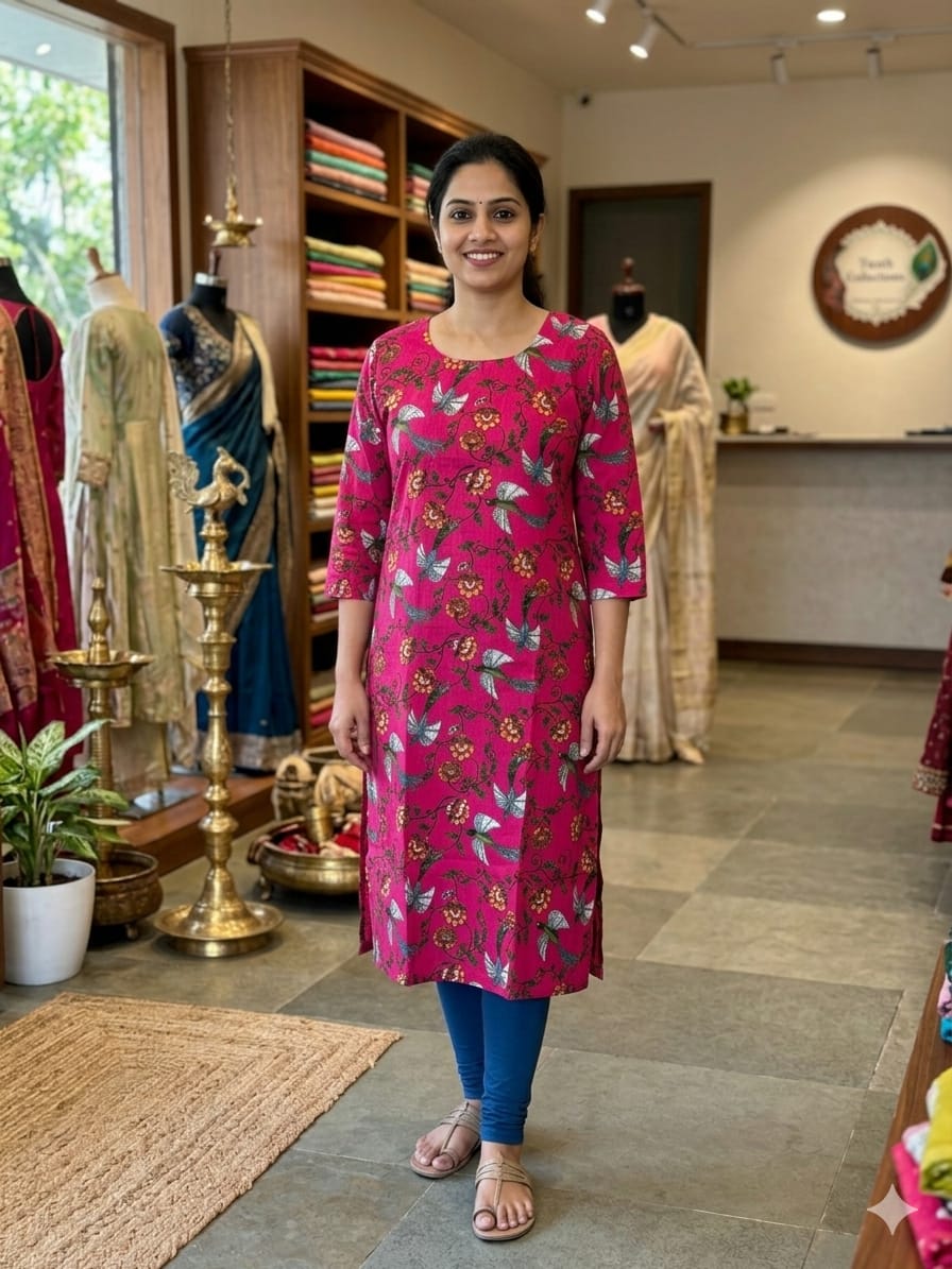 Crafted from breathable cotton fabric, this straight-cut kurti offers a perfect blend of comfort and everyday elegance. Ideal for casual wear, office looks, or light outings.