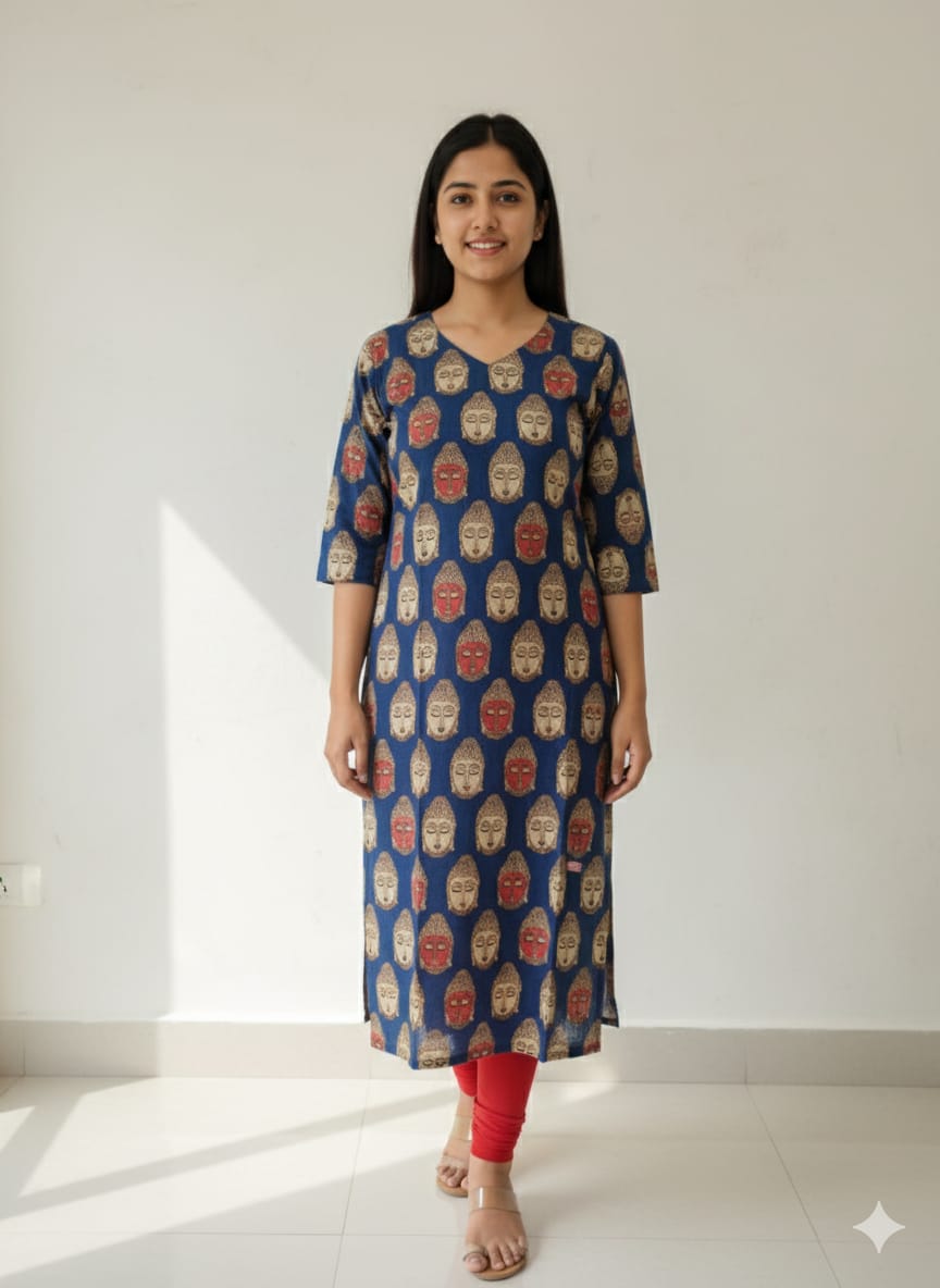 This is a handcrafted Kalamkari garment. Slight color smudges, light paint stains, or minor misprints may be present due to the hand-painting process. These are natural characteristics of authentic Kalamkari art and are not considered defects; therefore, they are not eligible for return or exchange.