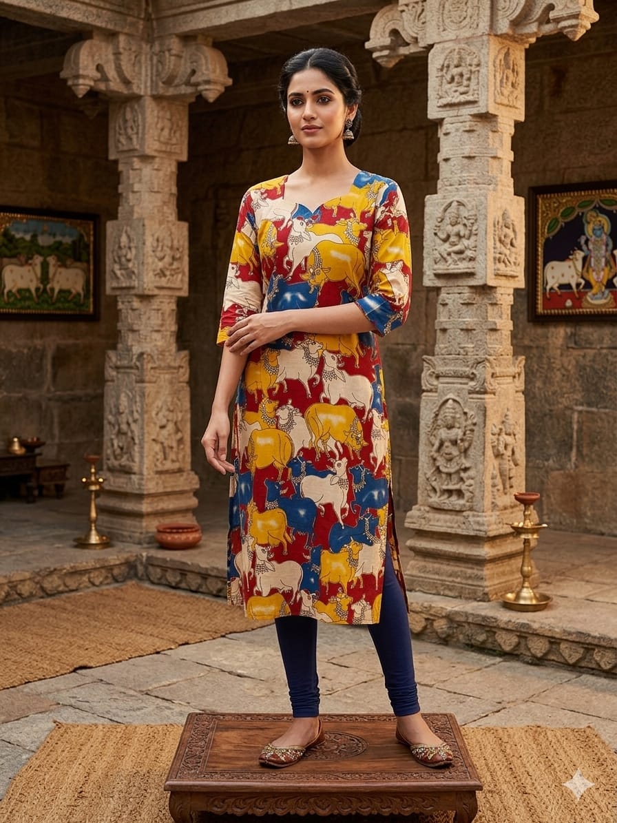 This Kalamkari garment is completely handcrafted, making each piece unique 🌿 Slight color variations, light paint marks, or minor misprints may occur due to the hand-painting process. These are natural characteristics of authentic craftsmanship and not defects.