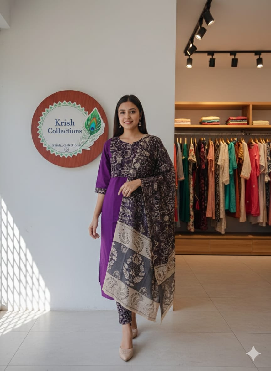 Fabric: comfortable cotton blend with kalamkari patch work bottom : Kalamkari cotton pant