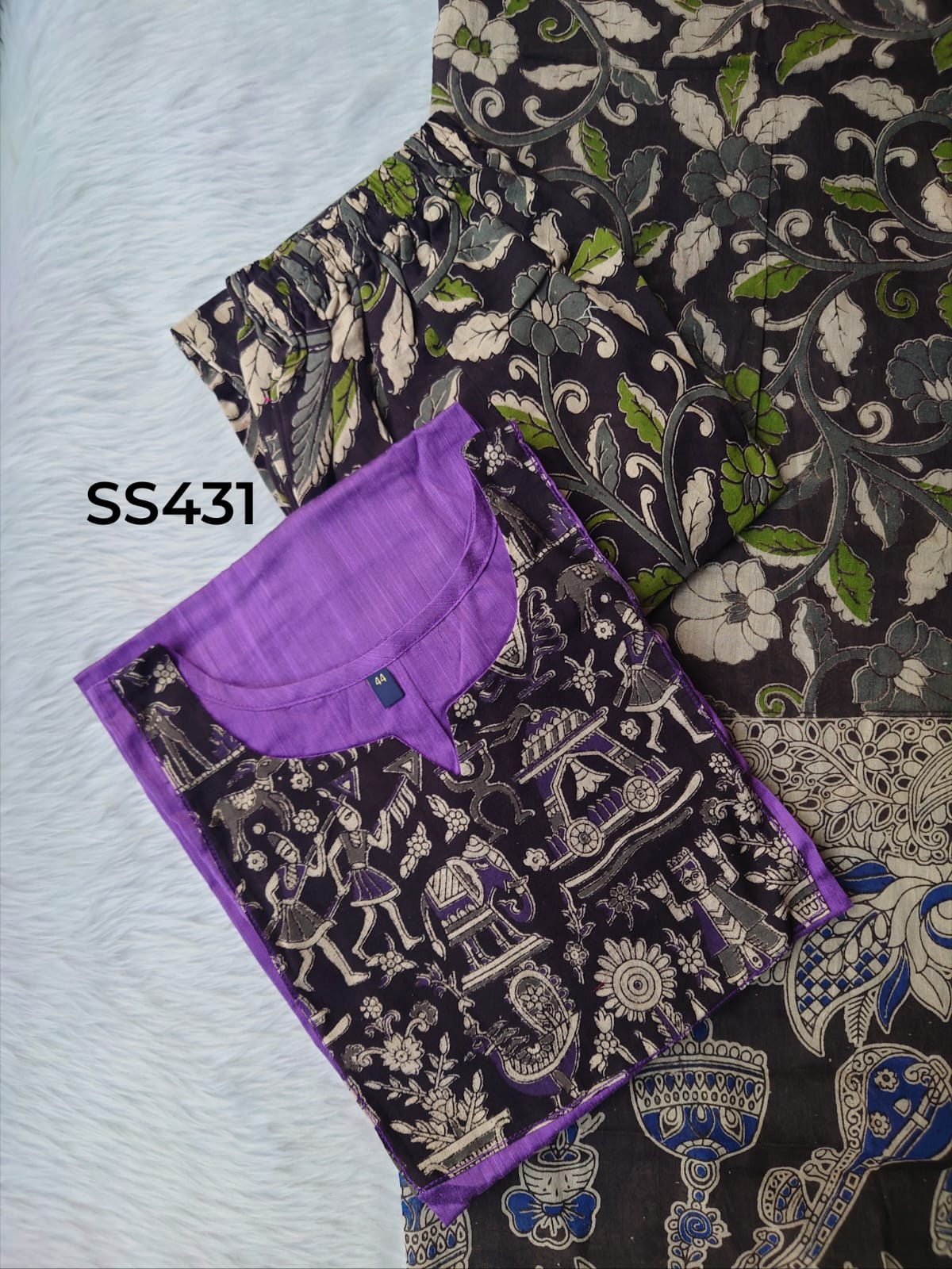 Design: All-over traditional kalamkari print with contrast detailing.
