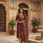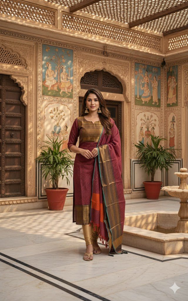 Crafted from premium Kanchi Cotton, renowned for its smooth texture, breathable comfort, and durable quality. The fabric carries a subtle natural sheen that enhances its rich, traditional charm.