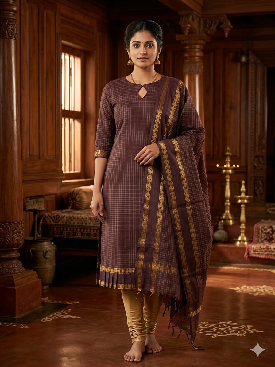 Crafted from premium Kanchi Cotton, renowned for its smooth texture, breathable comfort, and durable quality. The fabric carries a subtle natural sheen that enhances its rich, traditional charm.