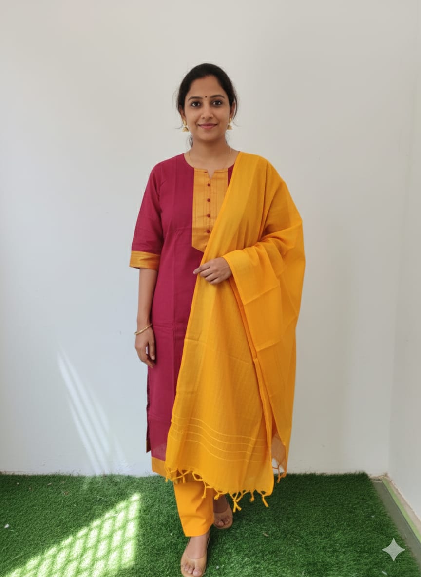 Design Highlight: Traditional cotton dupatta with contrast temple border and elegant tassels