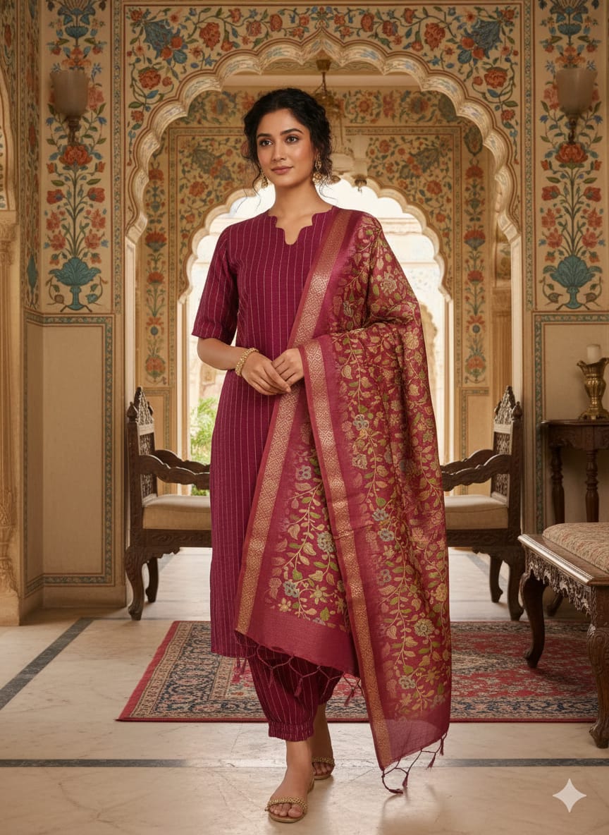 • Fabric: Premium Raw Silk Cotton (Beige Vertical Stripe Weave)