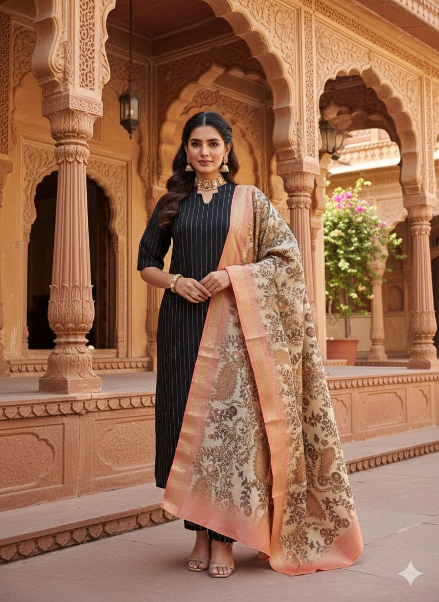 • Fabric: Premium Raw Silk Cotton (Beige Vertical Stripe Weave)