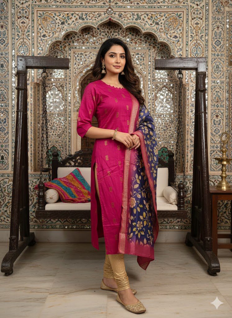 Design: Raw silk Kurti paired with elegant Kalamkari Dupatta