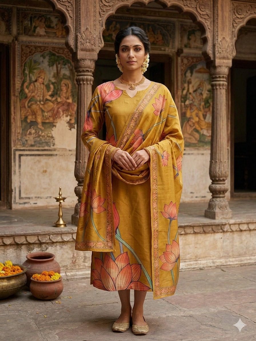 Step into timeless elegance with this beautifully crafted Tussar Silk Kurti Set, designed for a graceful and sophisticated look.