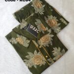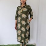 Stay effortlessly stylish in this elegant olive green floral cotton kurti set. Designed for both comfort and grace, this outfit features a subtle beige floral print that adds a touch of charm. The collared neckline with button detailing gives it a smart, contemporary appeal β perfect for everyday wear, office, or casual outings.