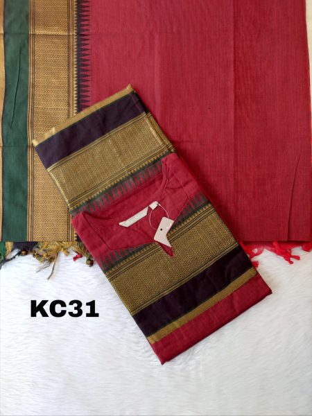 Crafted from premium Kanchi Cotton, renowned for its smooth texture, breathable comfort, and durable quality. The fabric carries a subtle natural sheen that enhances its rich, traditional charm.